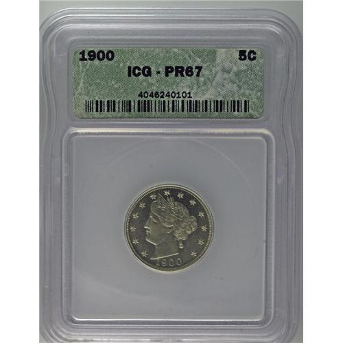 <B>1900<5C> PR67 ICG.</B></I> A sharply struck Superb Gem proof with hints of olive color over light gray surfaces. Although the devices are lustrous, neither side retains sufficient frost for a Cameo designation.