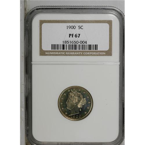 <B>1900 5C PR67 NGC.</B></I> Gorgeous honey-gold, salmon-pink, and lime-green patina adorns this intricately struck and refreshingly undisturbed Superb Gem. The proof mintage for the 1900 is not particularly low, but only a small portion has persisted in nearly immaculate condition, and only a handful of pieces are beautifully toned. Census: 26 in 67, 0 finer (10/06).<BR><BR><b>Shipping:</b> Coin/Currency (<a target="_blank" href="http://www.heritageauctions.com/common/shipping.php">view shipping information</a>)