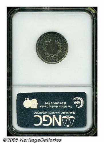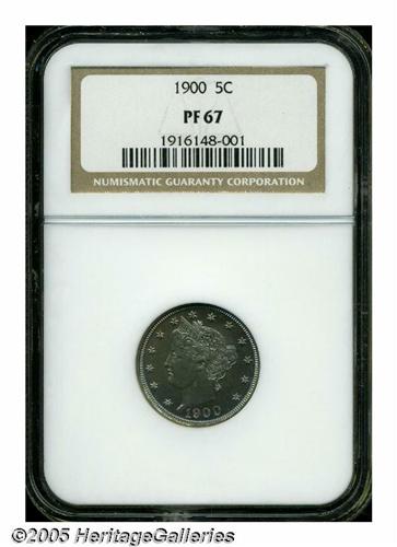 <B>1900<5C> PR67 NGC.</B></I> This gorgeous turn-of-the-century proof features a thin veneer of cobalt-blue and pale beige patina over luminous surfaces that are impeccably preserved with no significant contact marks or unsightly spots. The design elements are exquisitely struck, further enhancing the coin's excellent eye appeal. Population: 26 in 67, 0 finer (4/05).