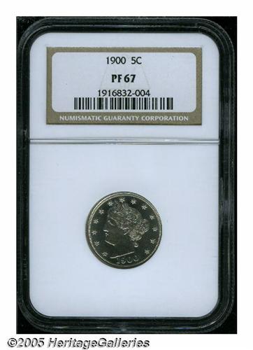 <B>1900<5C> PR67 NGC.</B></I> This razor-sharp Superb Gem displays noticeable frost throughout the devices, although Liberty's cheek and neck do not quite demonstrate sufficient contrast for a Cameo designation. Untoned, save for flecks of gray color on the forehead and at 9 o'clock.