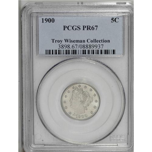 <B>1900<5C> PR67 PCGS.</B></I> A moderately reflective Superb Gem with hazy lavender-gray patina that covers both sides. The detail is bold. Population: 13 in 67, 1 finer (8/06).<BR><I>From The Troy Wiseman Collection.</B></I>