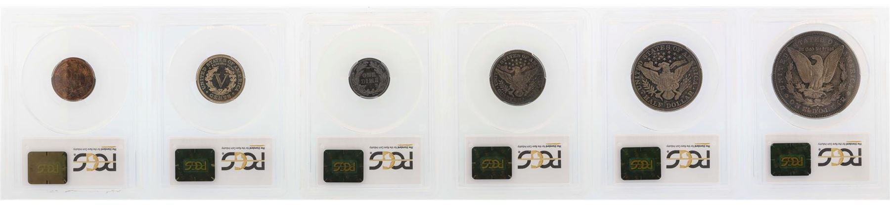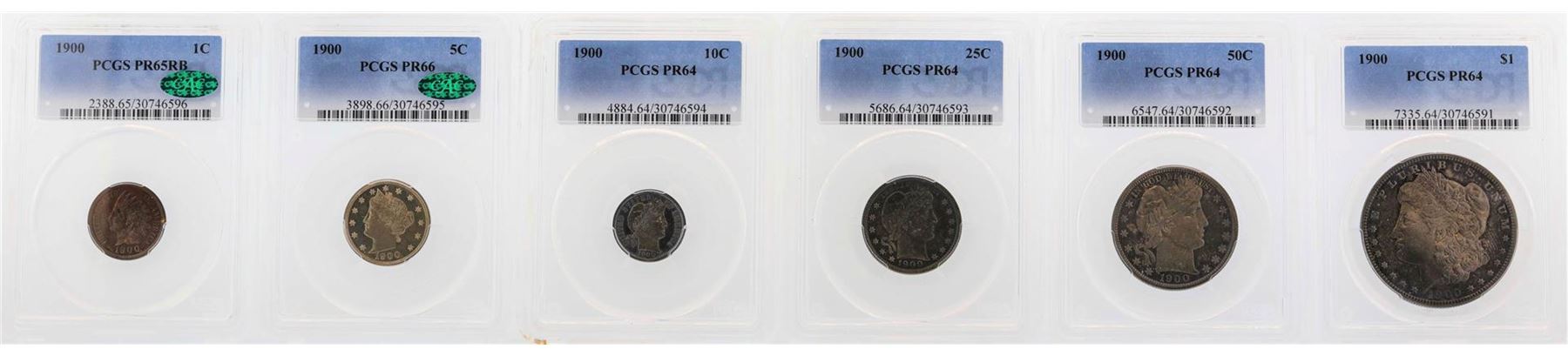 One 1900 (6) Coin Proof Set PCGS Graded containing the following coins: 1900 Indian Head Cent PCGS PR65RB CAC, 1900 Liberty Head Nickel Coin PCGS PR66 CAC, 1900 Barber Dime Coin PCGS PR64, 1900 Barber Quarter Coin PCGS PR64, 1900 Barber Half Dollar Coin PCGS PR64, and a 1900 $1 Morgan Silver Dollar Coin PCGS PR64. This is a rare proof set to be offered and would make a great addition to any collection. PCGS Graded.