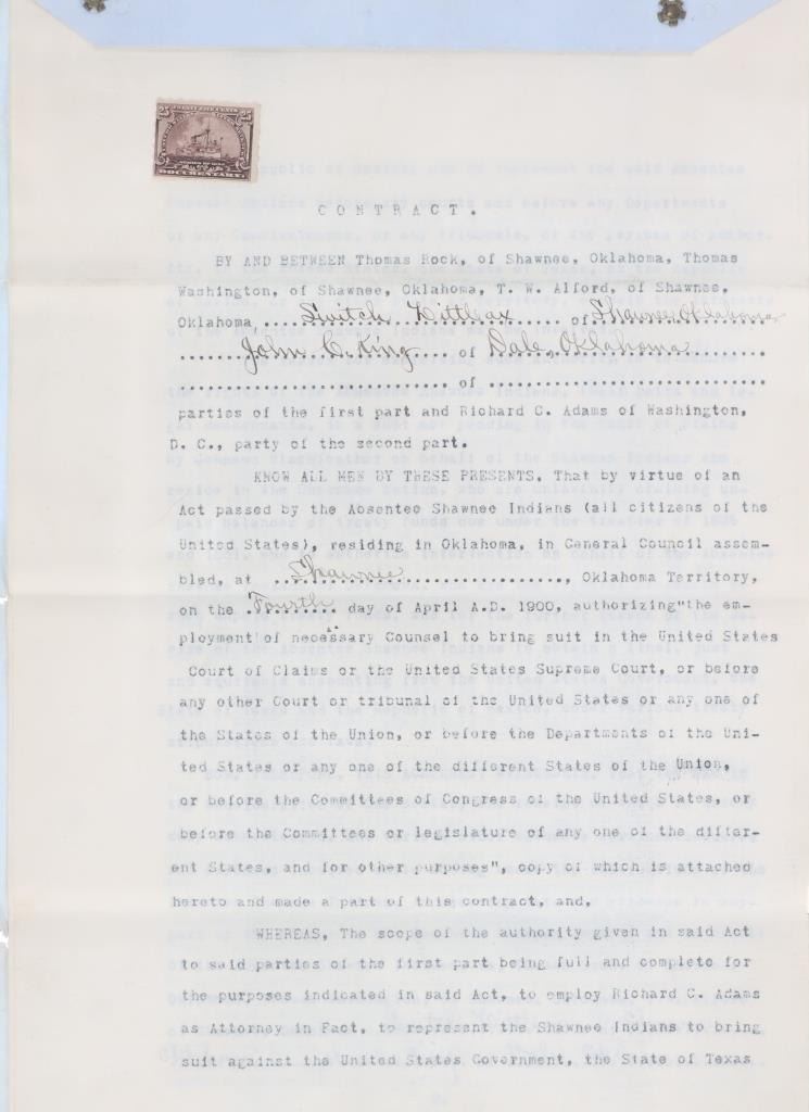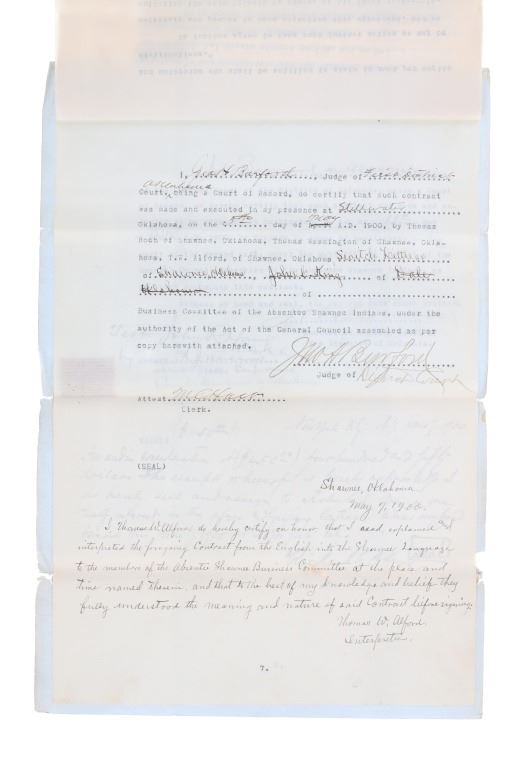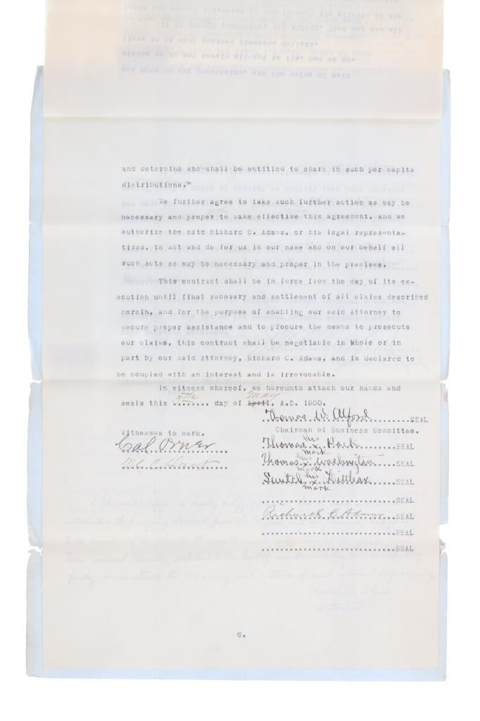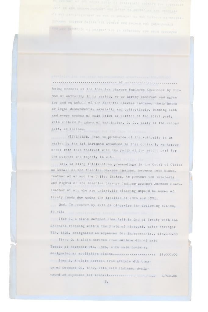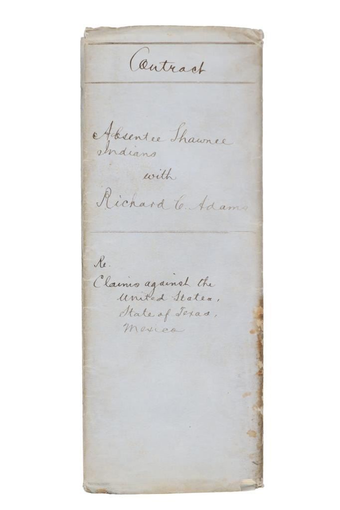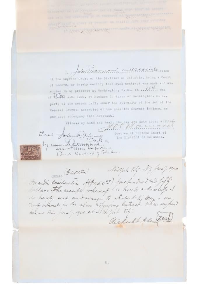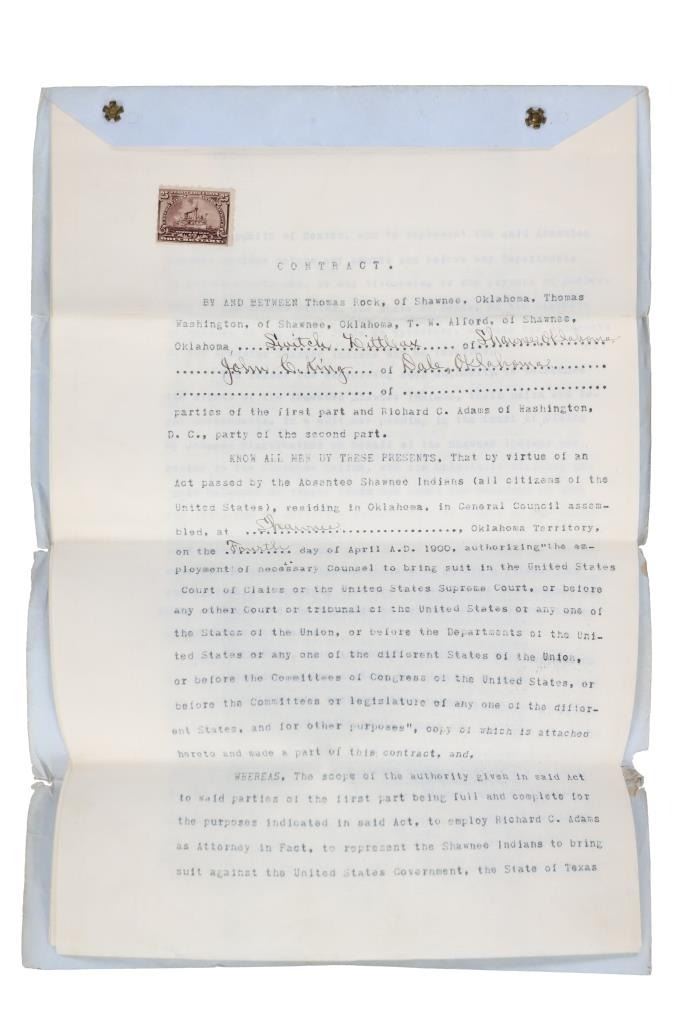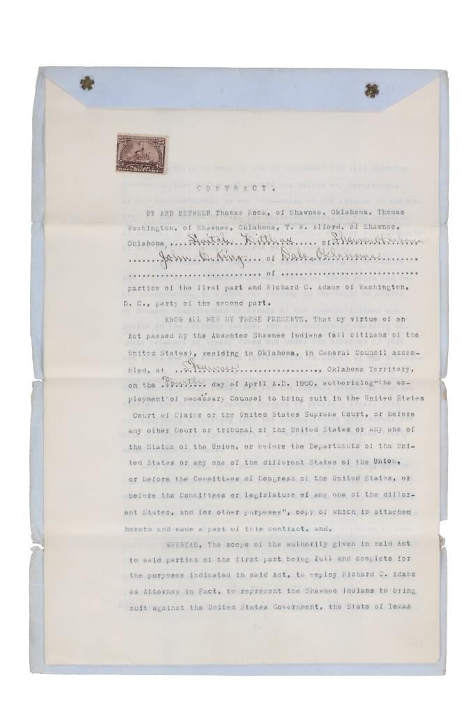 Featured in this lot is this authentic original contract for representation by Richard C. Adams for the Absentee Shawnee Indian Committee in 1900; the contract is in conjunction with the treaties of 1825 and 1832. The Absentee Shawnee treaties of 1825 and 1832 were part of a broader U.S. policy to remove Native peoples from their ancestral homelands and relocate them west of the Mississippi River. In the Treaty of 1825, the Absentee Shawnee, so called because they had separated from the main body of the Shawnee Nation and moved into Missouri, agreed to relinquish large tracts of land in exchange for a designated reservation along the Kansas River in present-day eastern Kansas. The agreement reflected both the pressure of American expansion into Missouri and the federal government’s intent to consolidate tribes into specific areas to free up land for settlement. While it guaranteed certain rights, including protection from white encroachment and some provision for goods and annuities, the treaty ultimately marked the beginning of a series of displacements for the group. By the Treaty of 1832, conditions for the Absentee Shawnee had worsened. Continued settler intrusion and conflicts with neighboring tribes pushed them to cede their Kansas holdings and accept new lands further south in present-day Oklahoma. This treaty further diminished their territorial base and required yet another migration, contributing to instability in their communities. The 1832 agreement also reflected the shifting U.S. Indian policy of the Jacksonian era, which favored rapid removal and resettlement to make way for westward expansion. Together, these treaties illustrate the forced mobility and loss of land that the Absentee Shawnee endured during the early 19th century, setting the stage for their later history in Indian Territory. The condition of this this authentic Legal Contract is well preserved with some browning to the cover page and legal document proper but otherwise shows a well preserved overall condition. The measurements of this contract is 13" x 8 7/8". The collective weight of this document is U4oz.