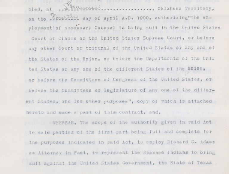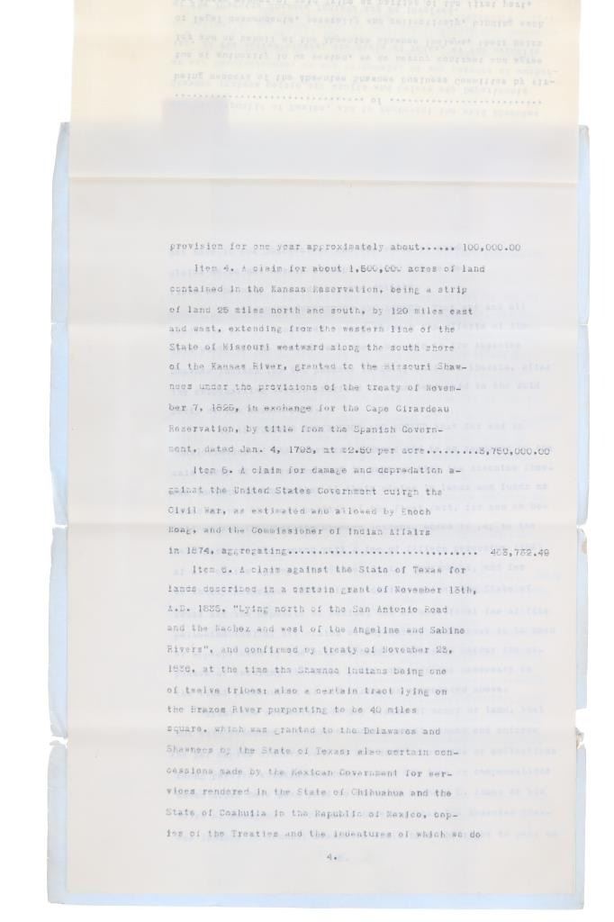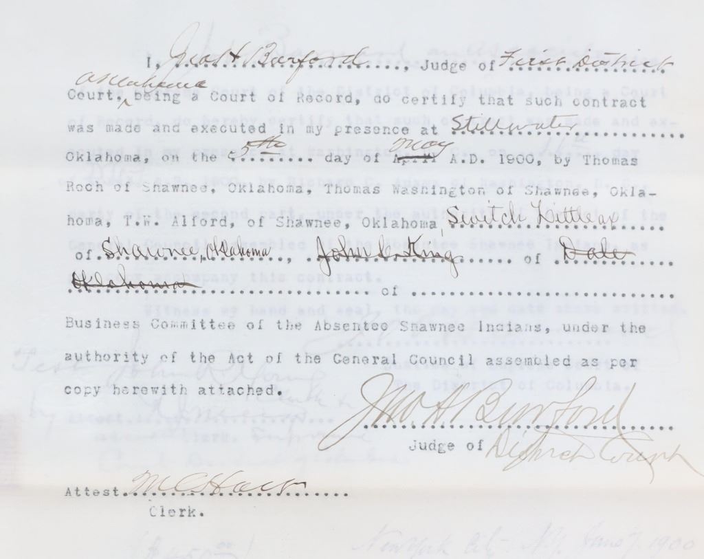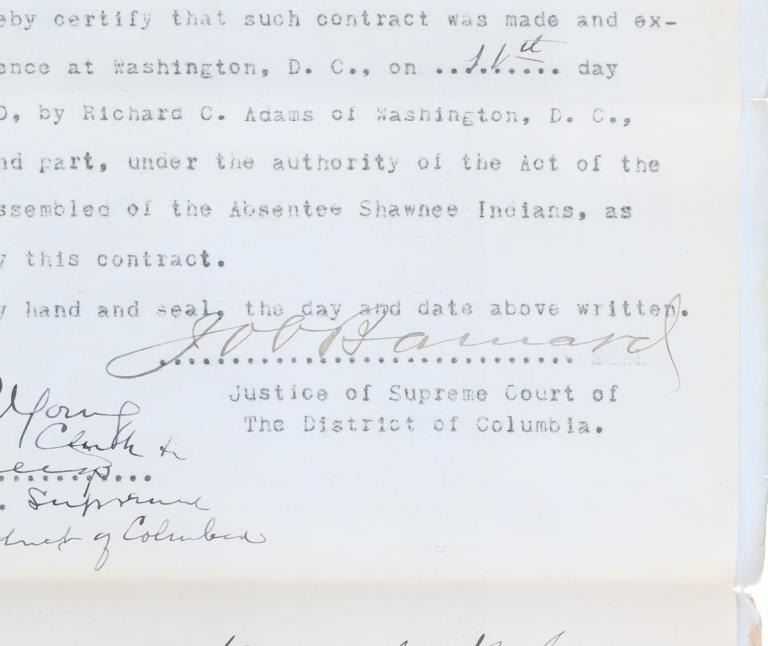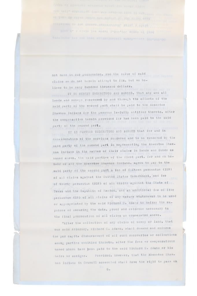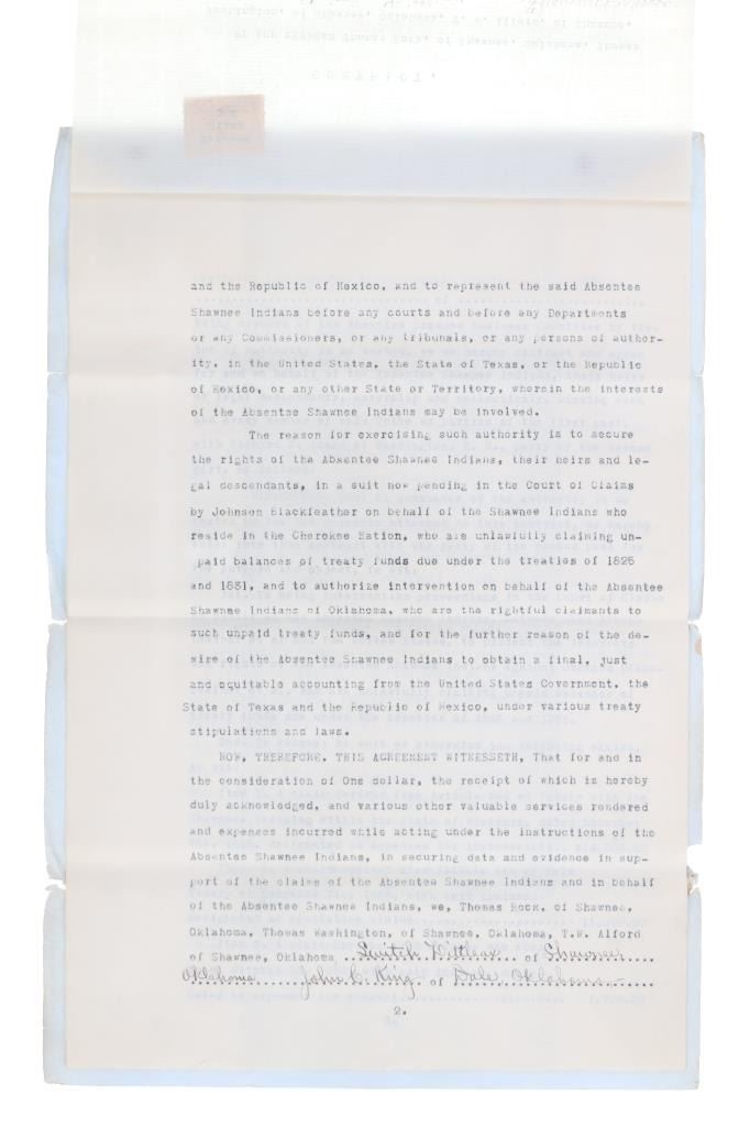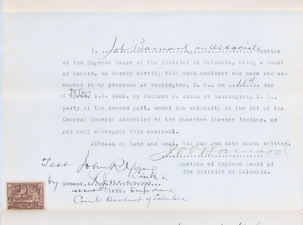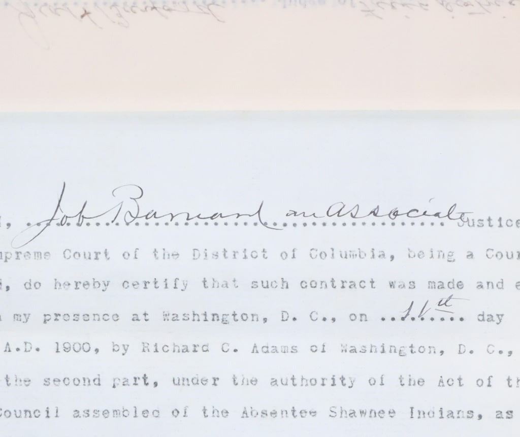 Featured in this lot is this authentic original contract for representation by Richard C. Adams for the Absentee Shawnee Indian Committee in 1900; the contract is in conjunction with the treaties of 1825 and 1832. The Absentee Shawnee treaties of 1825 and 1832 were part of a broader U.S. policy to remove Native peoples from their ancestral homelands and relocate them west of the Mississippi River. In the Treaty of 1825, the Absentee Shawnee, so called because they had separated from the main body of the Shawnee Nation and moved into Missouri, agreed to relinquish large tracts of land in exchange for a designated reservation along the Kansas River in present-day eastern Kansas. The agreement reflected both the pressure of American expansion into Missouri and the federal government’s intent to consolidate tribes into specific areas to free up land for settlement. While it guaranteed certain rights, including protection from white encroachment and some provision for goods and annuities, the treaty ultimately marked the beginning of a series of displacements for the group. By the Treaty of 1832, conditions for the Absentee Shawnee had worsened. Continued settler intrusion and conflicts with neighboring tribes pushed them to cede their Kansas holdings and accept new lands further south in present-day Oklahoma. This treaty further diminished their territorial base and required yet another migration, contributing to instability in their communities. The 1832 agreement also reflected the shifting U.S. Indian policy of the Jacksonian era, which favored rapid removal and resettlement to make way for westward expansion. Together, these treaties illustrate the forced mobility and loss of land that the Absentee Shawnee endured during the early 19th century, setting the stage for their later history in Indian Territory. The condition of this this authentic Legal Contract is well preserved with some browning to the cover page and legal document proper but otherwise shows a well preserved overall condition. The measurements of this contract is 13" x 8 7/8". The collective weight of this document is U4oz.