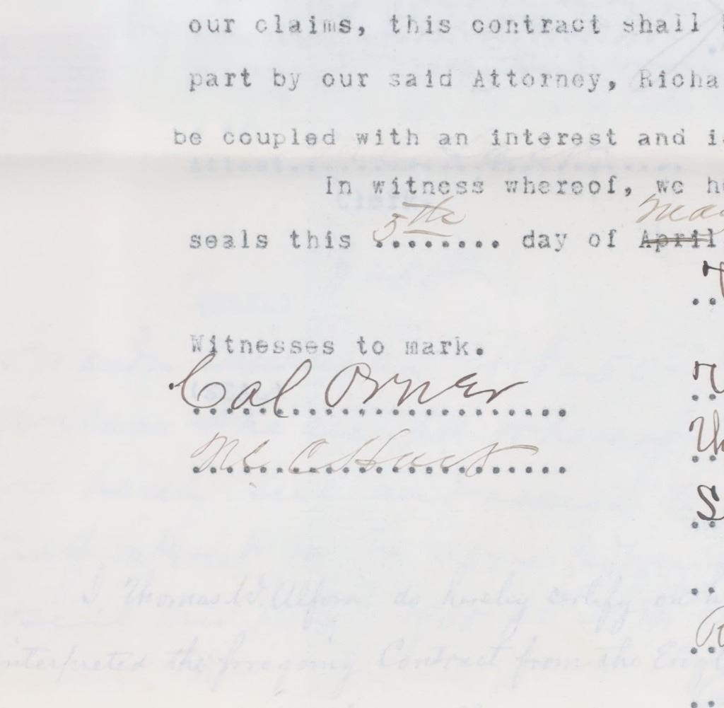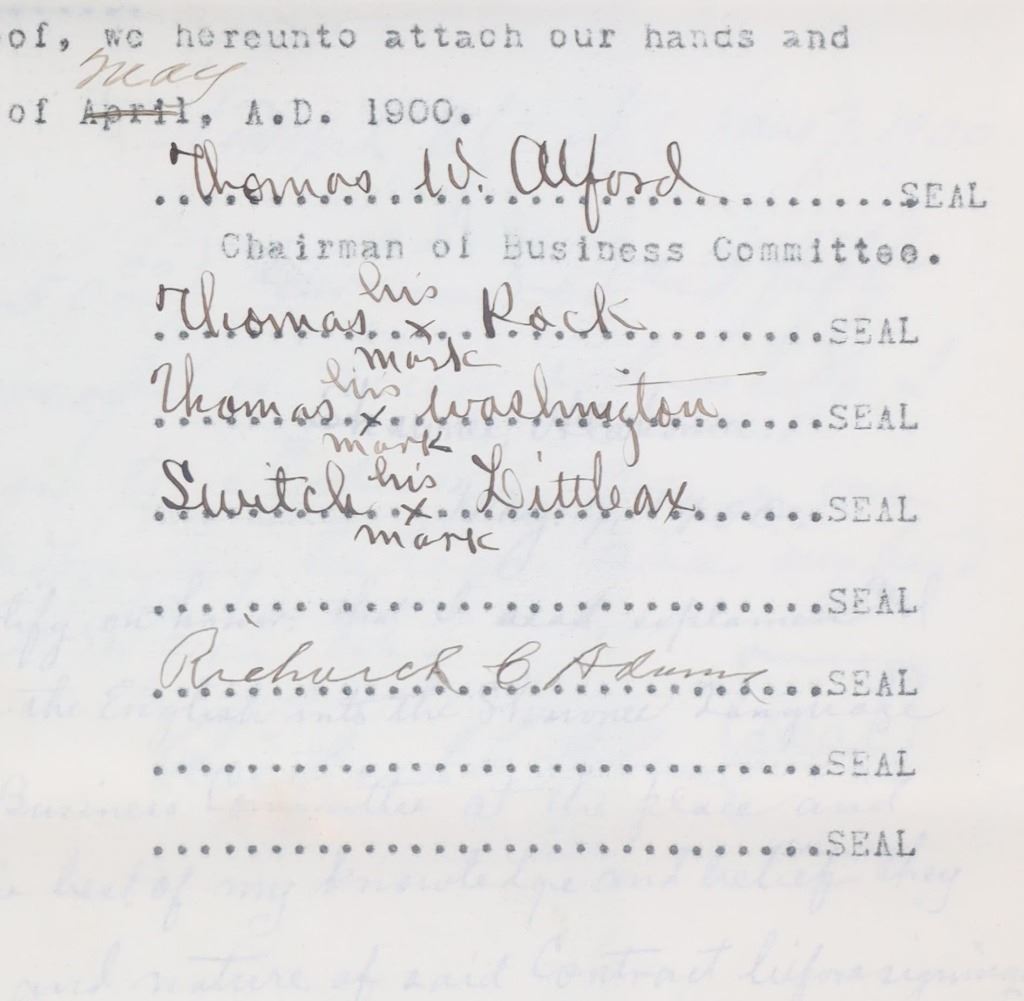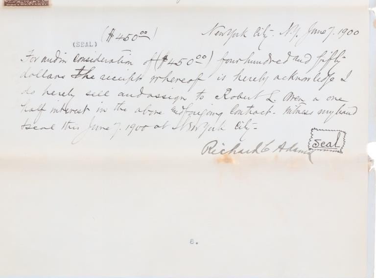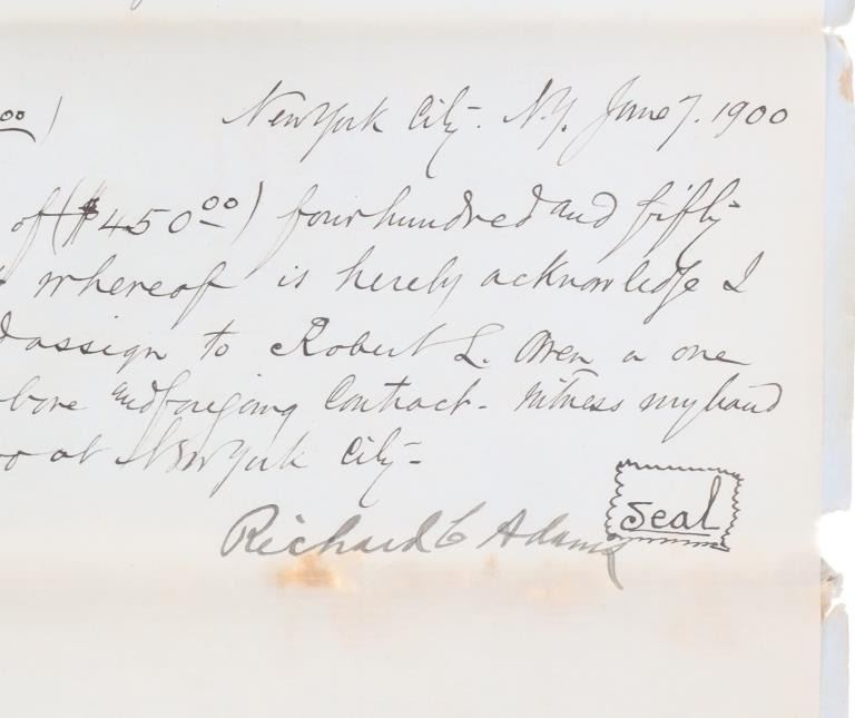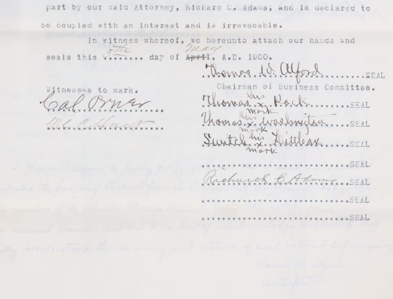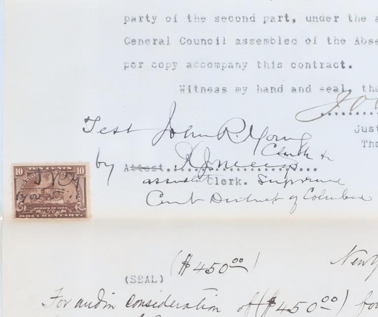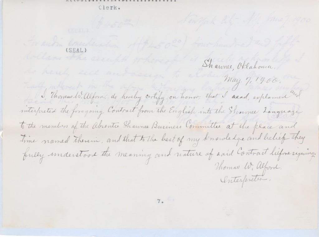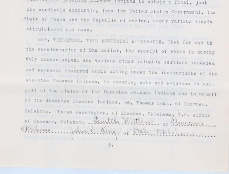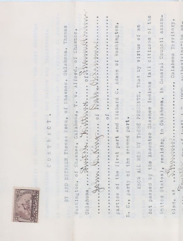 Featured in this lot is this authentic original contract for representation by Richard C. Adams for the Absentee Shawnee Indian Committee in 1900; the contract is in conjunction with the treaties of 1825 and 1832. The Absentee Shawnee treaties of 1825 and 1832 were part of a broader U.S. policy to remove Native peoples from their ancestral homelands and relocate them west of the Mississippi River. In the Treaty of 1825, the Absentee Shawnee, so called because they had separated from the main body of the Shawnee Nation and moved into Missouri, agreed to relinquish large tracts of land in exchange for a designated reservation along the Kansas River in present-day eastern Kansas. The agreement reflected both the pressure of American expansion into Missouri and the federal government’s intent to consolidate tribes into specific areas to free up land for settlement. While it guaranteed certain rights, including protection from white encroachment and some provision for goods and annuities, the treaty ultimately marked the beginning of a series of displacements for the group. By the Treaty of 1832, conditions for the Absentee Shawnee had worsened. Continued settler intrusion and conflicts with neighboring tribes pushed them to cede their Kansas holdings and accept new lands further south in present-day Oklahoma. This treaty further diminished their territorial base and required yet another migration, contributing to instability in their communities. The 1832 agreement also reflected the shifting U.S. Indian policy of the Jacksonian era, which favored rapid removal and resettlement to make way for westward expansion. Together, these treaties illustrate the forced mobility and loss of land that the Absentee Shawnee endured during the early 19th century, setting the stage for their later history in Indian Territory. The condition of this this authentic Legal Contract is well preserved with some browning to the cover page and legal document proper but otherwise shows a well preserved overall condition. The measurements of this contract is 13" x 8 7/8". The collective weight of this document is U4oz.