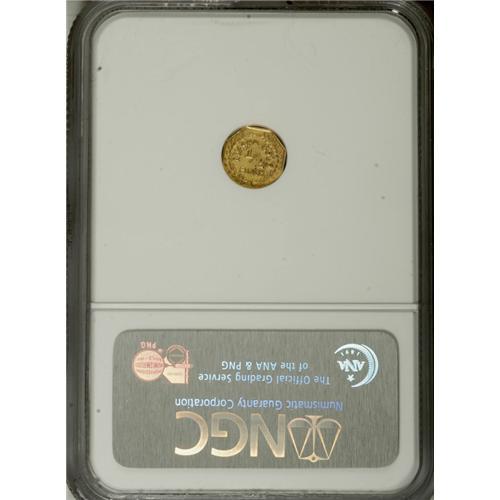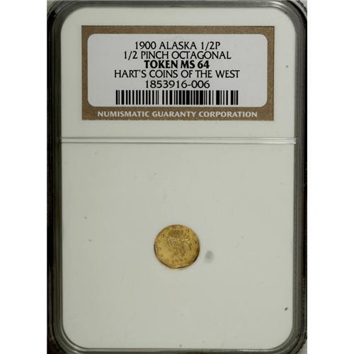 <B>1900 Alaska Gold Octagonal 1/2 Pinch MS64 NGC.</B></I> Gould-Bressett 144. Indian head left. A variant of GB-144 that has 16 stars instead of 13. From Hart's "Coins of the West" series. A satiny and completely problem-free piece with a radial die crack through star 5.<BR><I>From The Twin Hollows Collection, Part Two.</B></I><BR><BR><b>Shipping:</b> Coins & Currency (<a target="_blank" href="http://www.heritageauctions.com/common/shipping.php">view shipping information</a>)