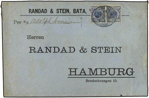 1900 BATA (Guinea Española) a HAMBURG. Circulada por buque alemán con dos sellos de 20 pf. azul matasellos ovalado de la línea marítima WEST AFRIKA-HAMBURG. MUY RARA.