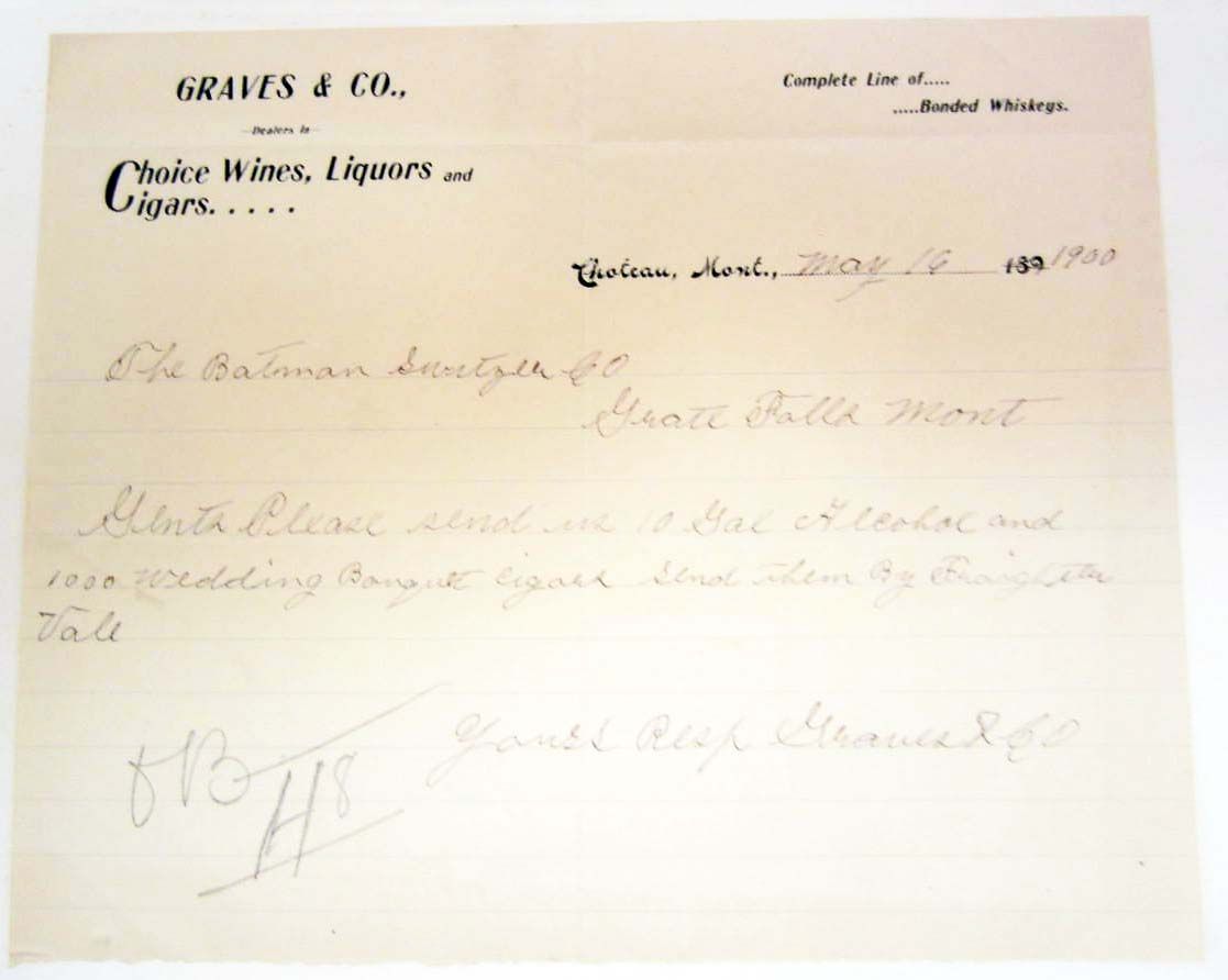 1900 BILLHEAD ORDER GRAVES & CO WINES, LIQUORS & CIGARS