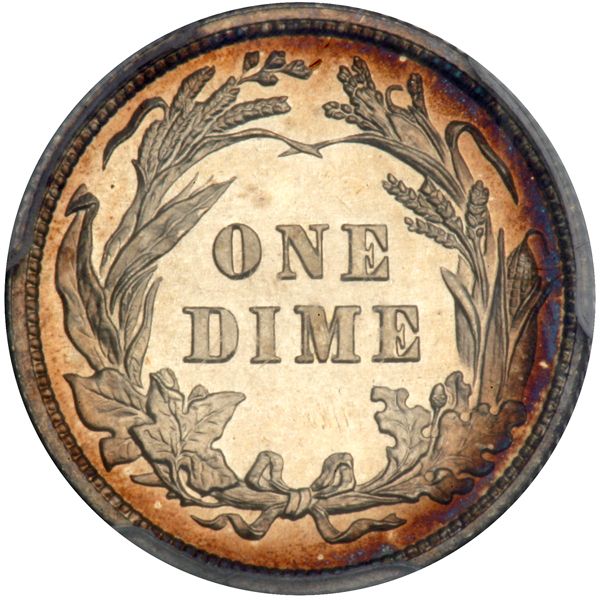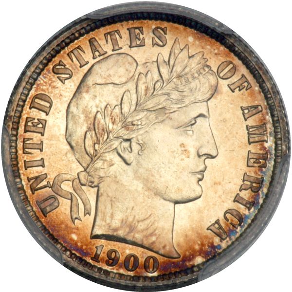 1900 Barber Dime. PCGS graded Proof 66 Cameo PQ CAC Approved. Only 912 struck. Lovely light golden toning. A cameo and lustrous gem with a nuance of faint champagne to rich amber on both sides. The strike is razor-sharp and complete, with extra bold detail on the crown of leaves worn by Liberty. Pop 15; 8 finer (PCGS # 84884) .