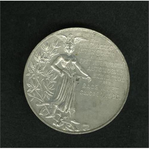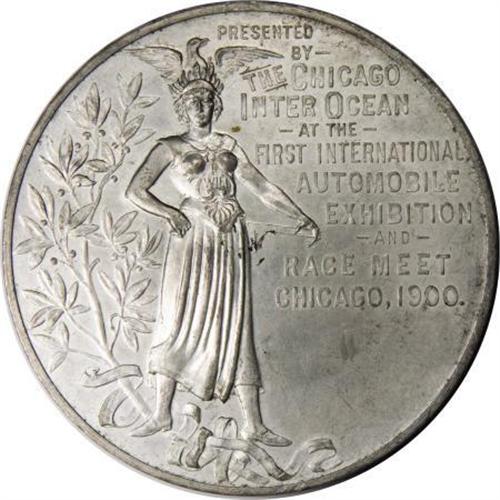 <B>1900 First International Automobile Exhibition and Race Meet, Chicago. </B></I> 63 mm, 138.7 gm, silver. Presented by the Chicago Inter Ocean Newspaper at the 1900 First Int'l Automobile and Exhibition and Race Meet in Chicago. <BR> <BR><BR><b>Shipping:</b> Coins & Currency (<a target="_blank" href="http://www.heritageauctions.com/common/shipping.php">view shipping information</a>)