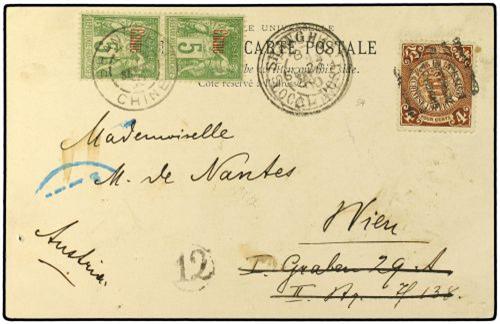 1900 Combination postcard to Vienna franked by China CIP 4 c. brown tied by black ´Pa-kua´ with Shanghai Local Post cds at left, France Chine 5 c. yellow green pair applied and tied (Sept 24) at French PO alongside.