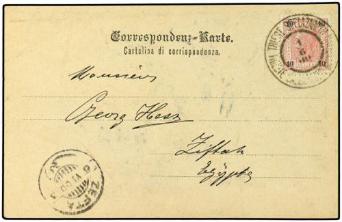 1900 Disenfected mail picture post card to EGYPT bearing Austria 10 heller red (Yvert 70) tied by TRIESTE LAZZARETTO MARITTIMO TRIEST SEELAZARETH double ring with ZEFTA arrival. Very rare item of mail for the disenfection specialist.