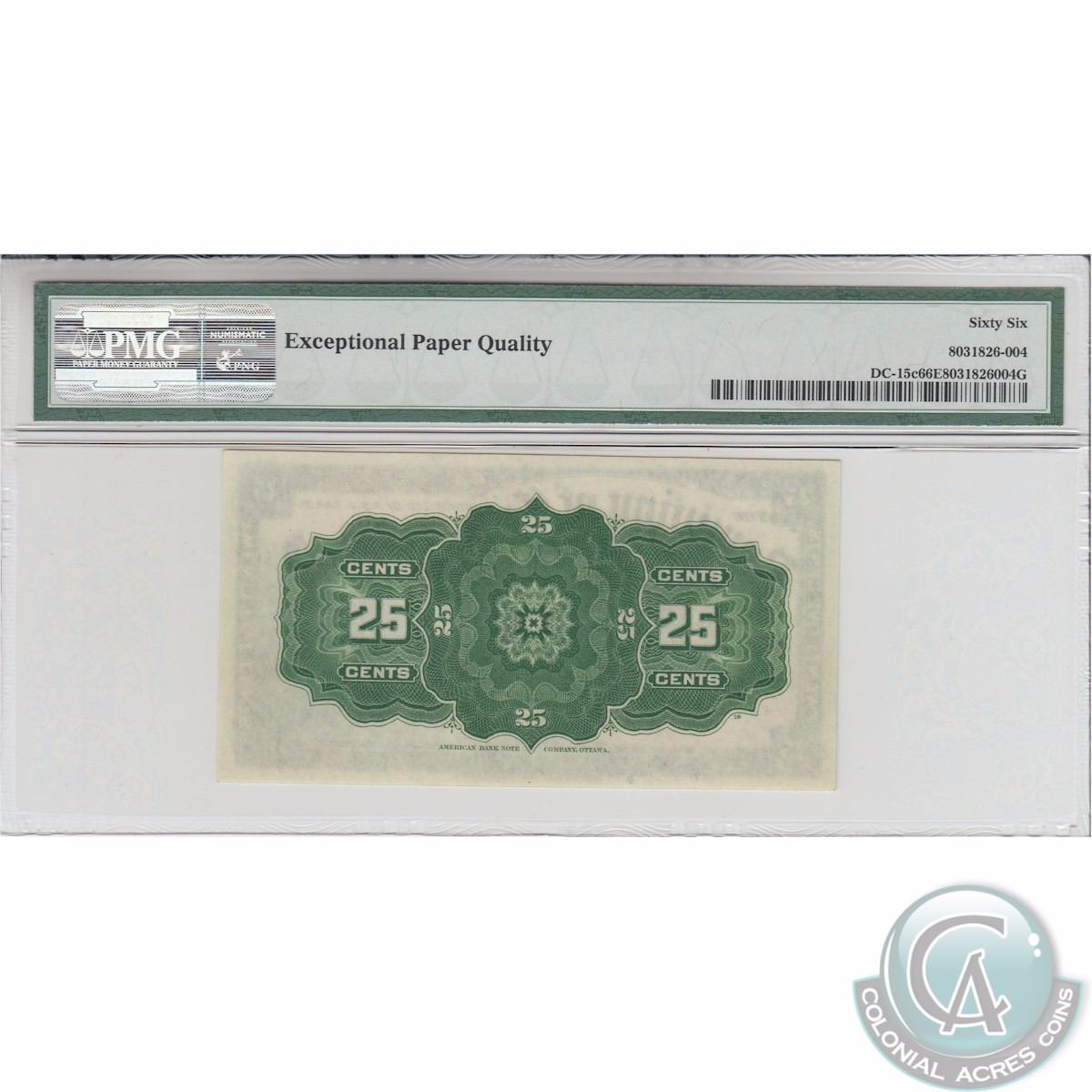 1900 Dominion of Canada 25-cent 'Shinplaster' DC-15c (Saunders), PMG Certified GEM UNC-66 EPQ! Top 2! Tied for the highest grade by PMG. Here is a chance to own one of only 2 notes ever certified in this grade by PMG. We acquired 3 original notes in a small envelope that were perfectly preserved, 2 of which achieved this top grade point. (PMG code -004)