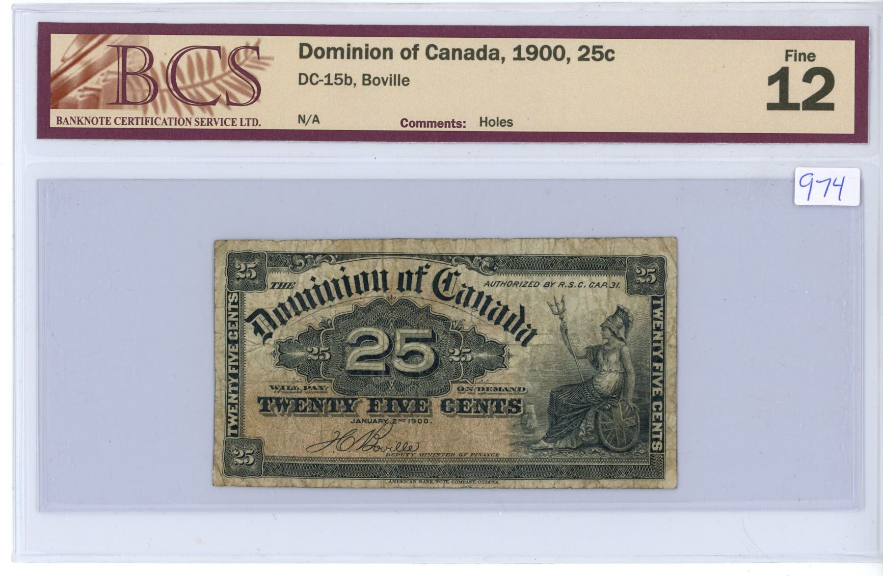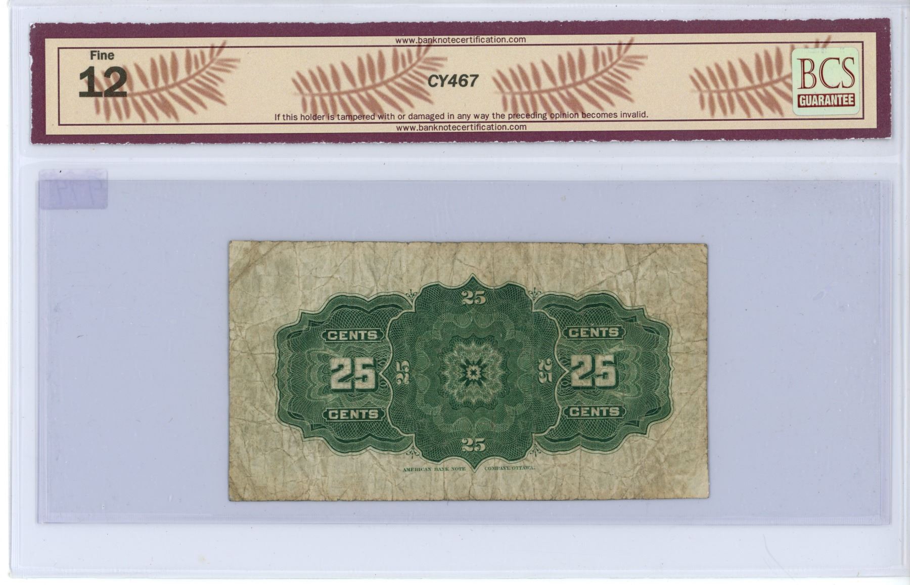 1900 Dominion of Canada 25 cent shinplaster - BCS graded: Fine 12
