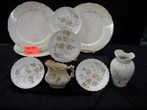 1900, ENGLISH, IRONSTONE & SEMI PORC OUTLINED FLORAL DESIGN LOT INCLUDES (3) PLATES, (4) BOWLS, (1) 6in VASE, (1) CREAM PITCHER, 9 PCS