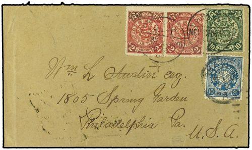 1900 Envelope to PHILADELPHIA franked 2c(2) + 10c. ´dragons´ tied by NEWOHWA date stamp. Obverse also bears overprinted Japanese 10sn tied by SHANGHAI I.J.P.O. cds