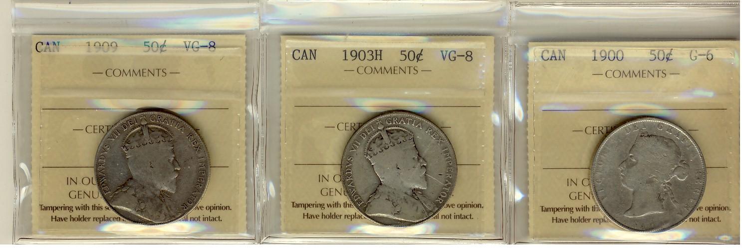 1900 G6, 1903h VG8 & 1909 VG8 50¢ Lot of 3 ICCS graded coins.