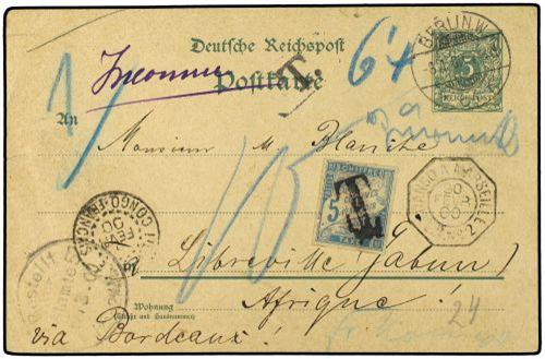 1900 German postal stationary card 5 pf green cancelled by BERLIN datestamp routed via French paquebot with octagonal LOANGO A MARSEILLE L.N. Nº 2 datestamp to the French Congo, underpaid with TAX handstamp and General French Colonies postage due 5 cents blue (Yvert 18) applied and tied on arrival by TAX handstamp. Very fine combination.