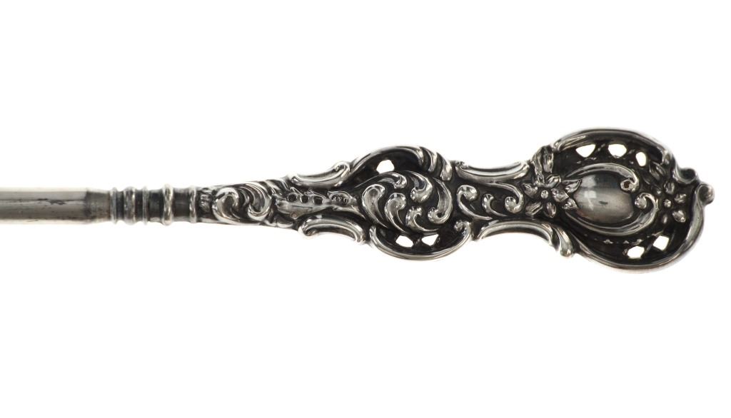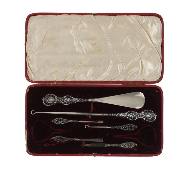 For your consideration is this wood box of sterling and steel tools made by Henry Matthews in Birmingham, England circa 1900. Henry Matthews was a Birmingham based silversmith; his first mark was registered in 1894. His office was on Vittoria Street, Birmingham. A Street that is famous for being part of the Jewelry Quarter in Birmingham. Matthews is particularly remembered for his small silver items that required great attention to detail. In 1930, Henry Matthews stopped production. The box has been painted red and once featured a working latch but has since been broken. The inside is lined with a maroon felt featuring designed spots for the tools on the bottom and an off-white linen on the top reading, "R. Stewart By Appointment to the Queen Glasgow" in gold gilt lettering. The tools included in this box are as follows: a large shoe horn, a large button hook, a small scalpel, a small button hook, pliers and a file. The box is missing two tools. The pieces are marked with stamps and the maker's mark. The steel proportions are stamped "Steel". The makers mark reads "H" "M", with the other stamps showing the Birmingham town mark, a lion passant indicating the quality of the silver, and the letter "a" indicating the year it was made (1900). The box shows fair condition with worn and chipped paint as well as chipping to some areas of the wood. The tools show good condition overall with the sterling proportions showing a light patina from their age and use over the years, but no obvious signs of damage are present on the tools. The box measures 6 3/8" L x 12 1/4" W x 1 1/4" H. The tools measure from 9 1/8" L x 1 1/2" W to 4 1/2" L x 5/8" W. The collective weight of the box and tools is approximately 1 pounds and 4 ounces.*