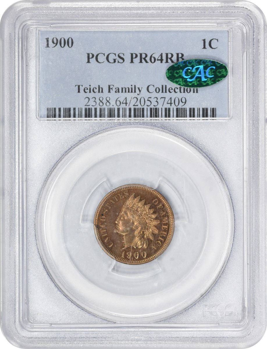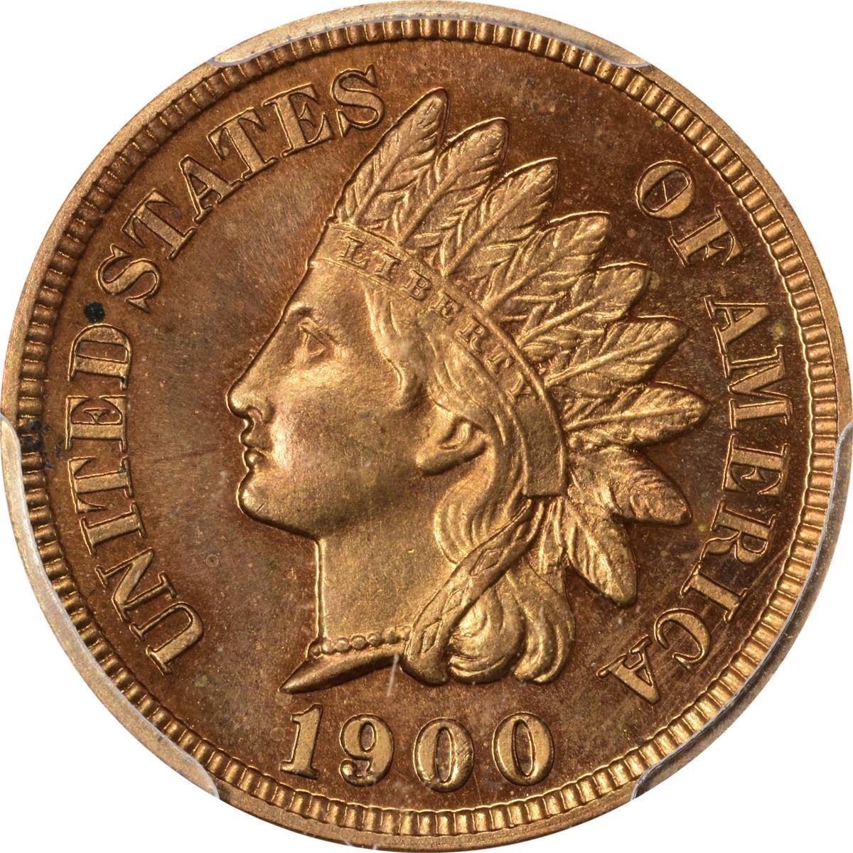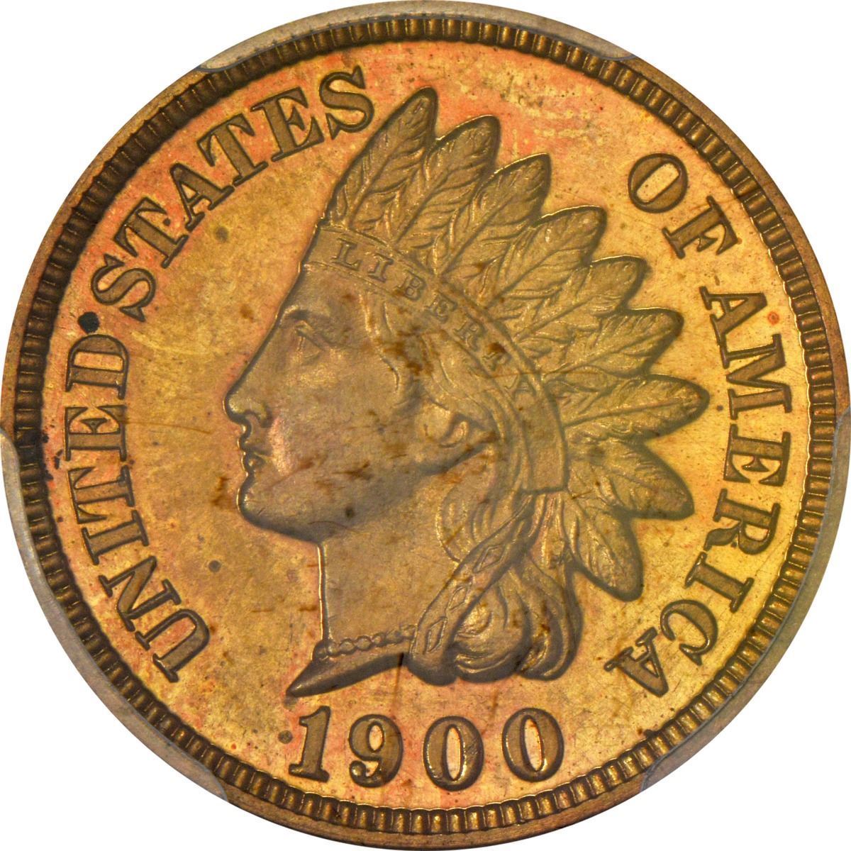 1900 Indian 1¢. Proof-64 RB PCGS. CAC. Bright rose-orange with golden highlights in the icon’s headdress details. Obverse toning spot between D and S near rim.