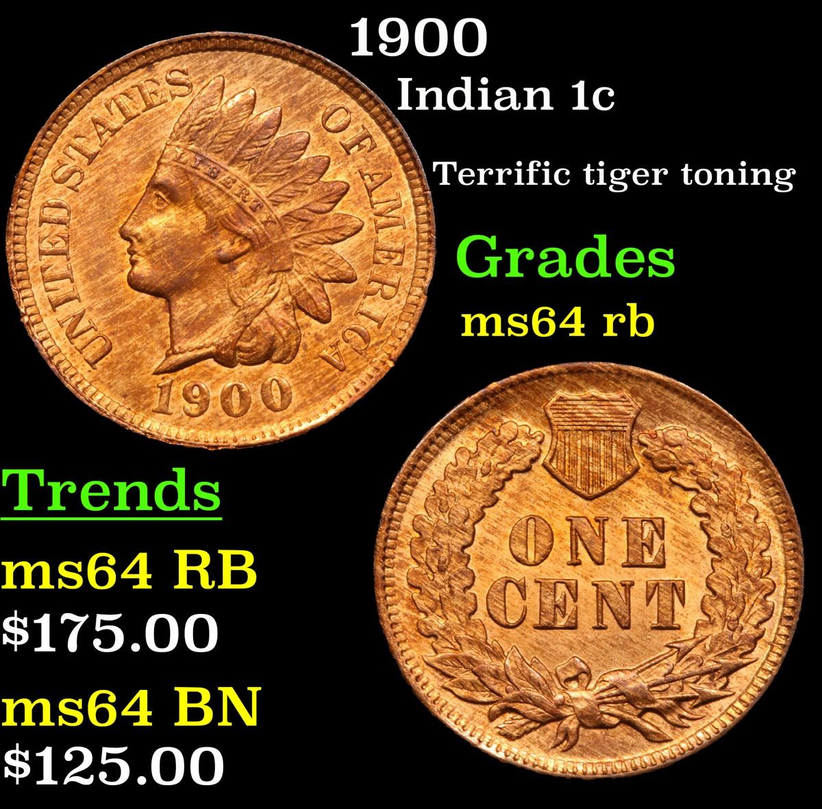 1900 Indian Cent 1c Grades Choice Unc RB.