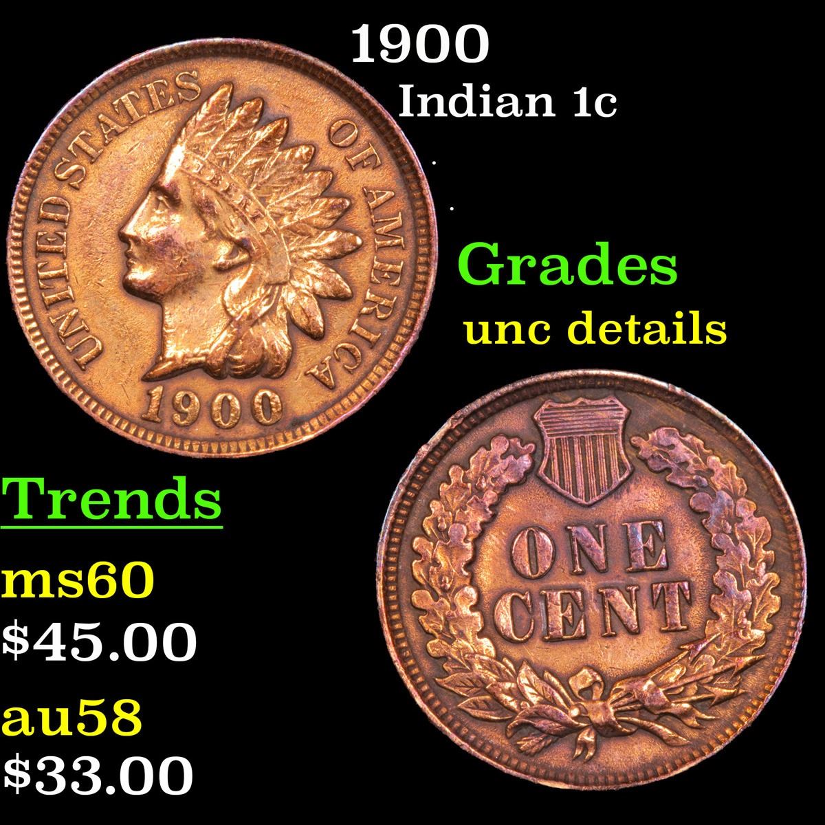 1900 . . Indian Cent 1c Grades Unc Details.