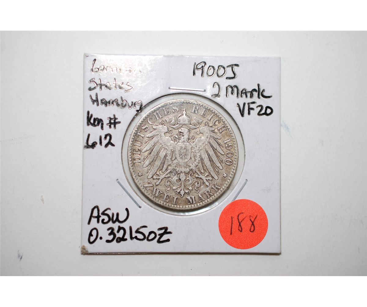 1900-J German Zwei Mark Foreign Coin; VF20; 0.3215 ASW; EST. $25-35