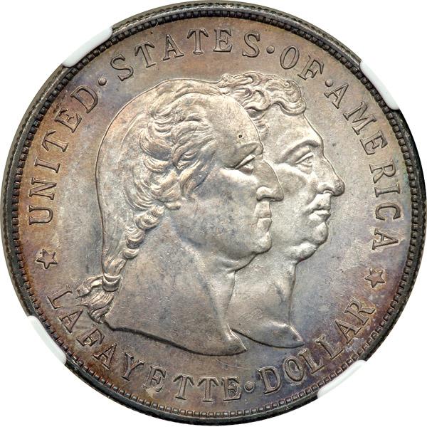 1900 Lafayette Dollar. NGC graded MS-65. A splendid gem specimen glimmering with undistrubed satiny mint luster which is further enhanced by a touch of golden sunset toning. Certainly one of the finer gem specimens we have handled.