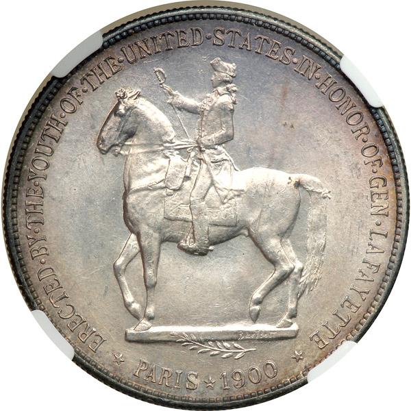 America's first Commemorative Silver Dollar, the designs were by Charles E. Barber after an engraving of Houdon's bust of Washington. On the reverse, Barber depicted the Lafayette equestrian statue at the Paris Exposition of 1900. Lafayette Dollars were sold to defray part of the cost of completing Paul Wayland Bartlett's statue of the French General, then under construction in Paris for display at the exposition. Out of an authorization for 50,000 pieces, 36,000 were sold, the remainder being melted. Very few Gems at the 65 level or beyond remain, as readers can ascertain here: Pop 186; 60 in 66, 8 in 67 (PCGS # 9222) .