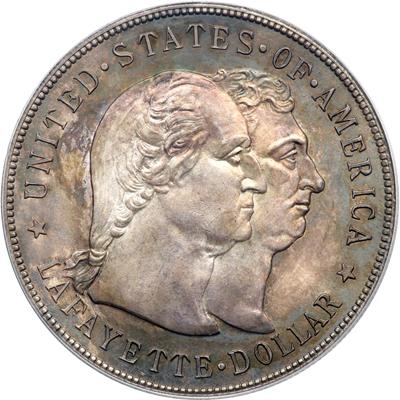 1900 Lafayette Dollar. PCGS graded MS-65. Nicely toned on both sides. A sparkling gem of the optimum quality for this actively collected denomination. Intense cartwheel luster blends effortlessly with lovely deep toning highlights on the satin surfaces. Devices are sharp in all areas, as struck, the Lafayette Dollar tends to be carefully made; it's just that afterwards collectors didn't handle them as judiciously as they should have. Mark-free gems such as this are desired by collectors, which the grading service has taken into consideration in assigning the MS65 grade. Potential bidders ought to think seriously of this matter before unleashing their bids! Pop 240; 85 finer; 80 in 66; 5 in 67. (PCGS # 9222).