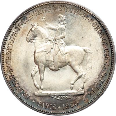 America's first Commemorative Silver Dollar, the designs were by Charles E. Barber after an engraving of Houdon's bust of Washington. On the reverse, Barber depicted the Lafayette equestrian statue at the Paris Exposition of 1900. Lafayette Dollars were sold to defray part of the cost of completing Paul Wayland Bartlett's statue of the French General, then under construction in Paris for display at the exposition. Out of an authorization for 50,000 pieces, 36,000 were sold, the remainder being melted.