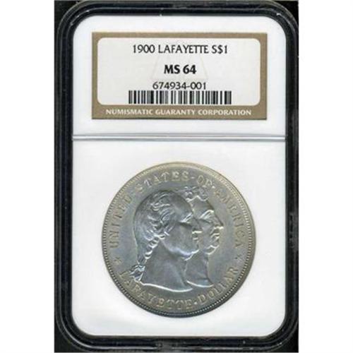 <b>1900 Lafayette Dollar. NGC graded MS64.</b> Aesthetically appealing, a handsome full strike bristling with choice bright white mint bloom and without problems. Struck with meticulous care by the dies, which is always preferred on this early commemorative silver dollar <b>(PCGS # 9222)</b>