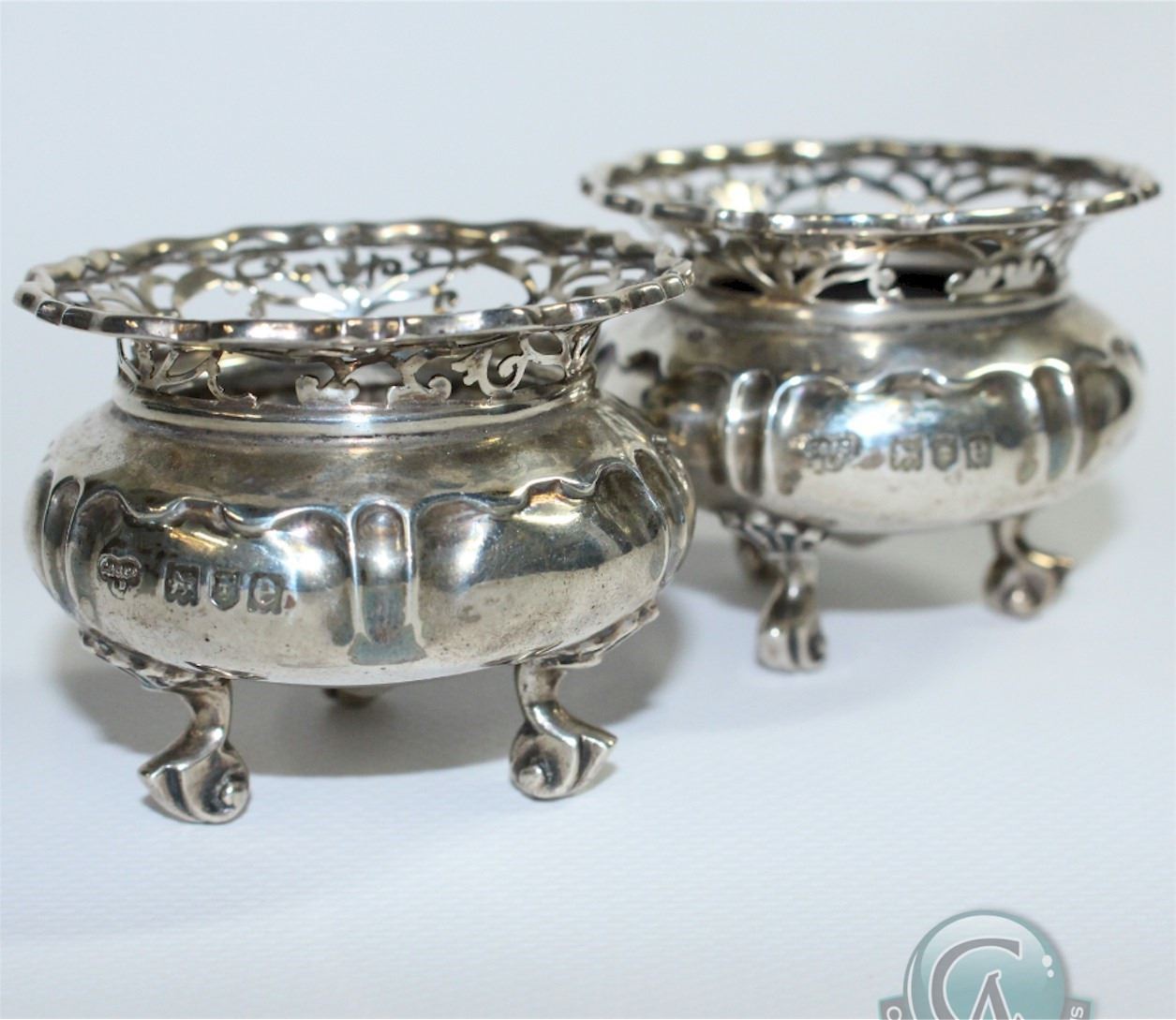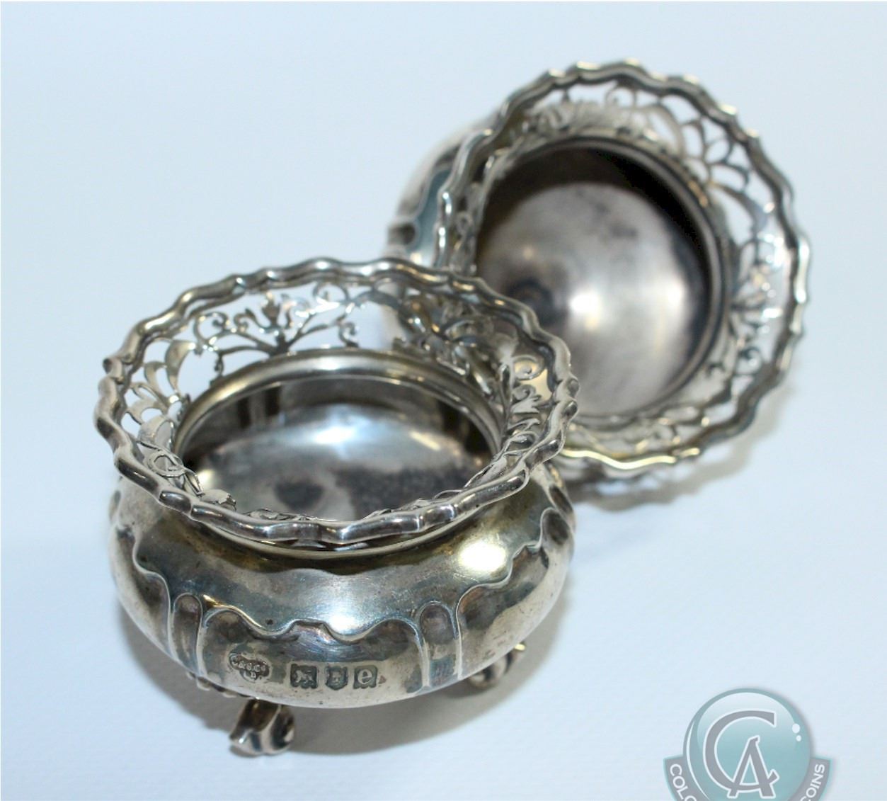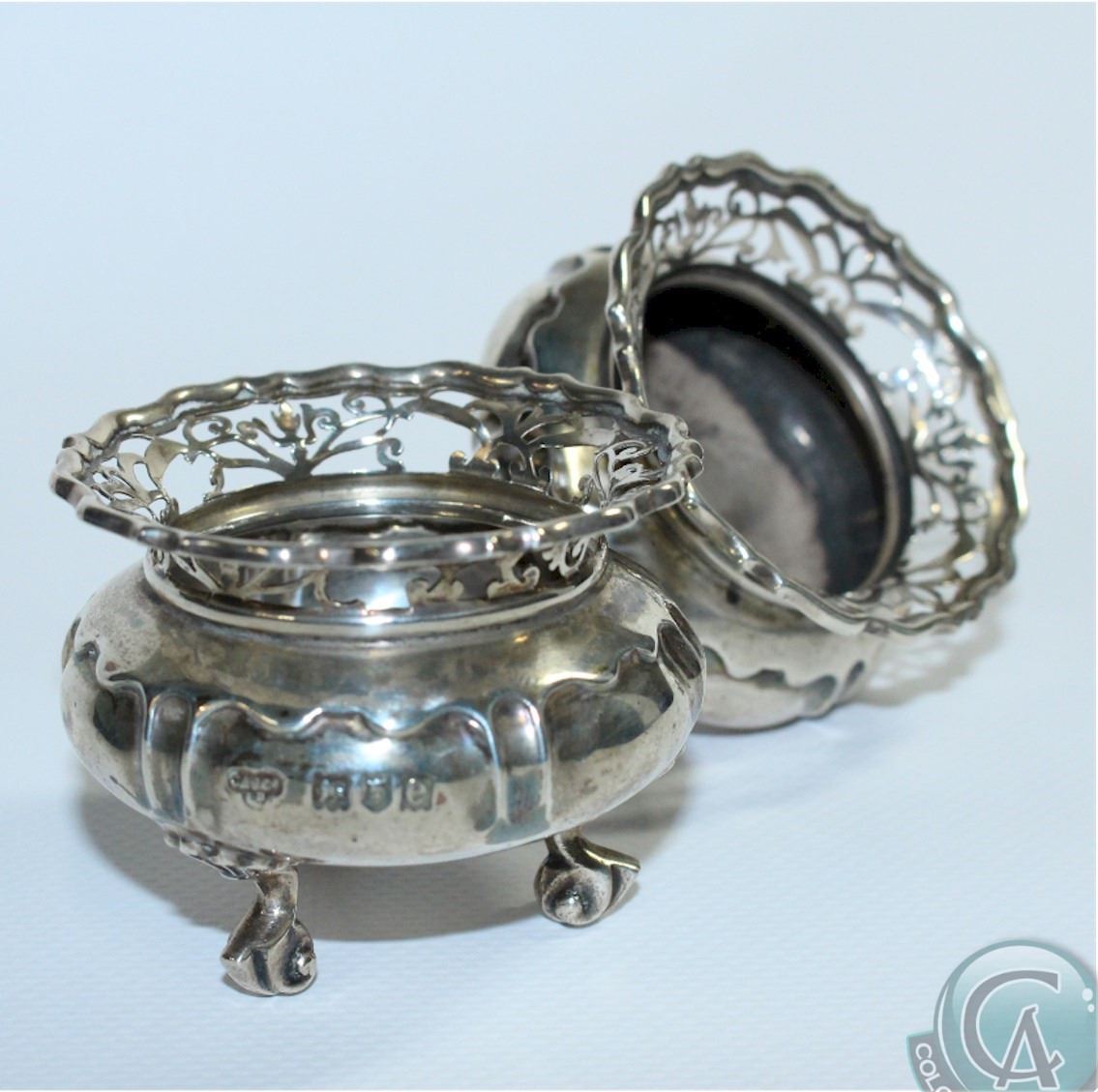 1900 London; Goldsmiths & Silversmiths Co. Ltd. Sterling Salt Cellars. Cellars stand 2 inches in Height and are beautifully made with pierced Borders. 2pcs.