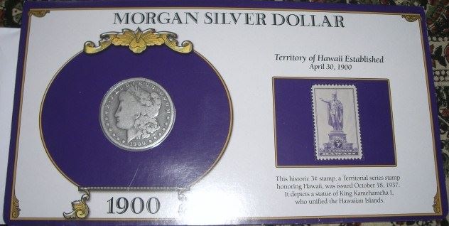 1900 MORGAN SILVER DOLLAR WITH TERRITORY OF HAWAII HISTORIC STAMP SET IN ORIGINAL PACKAGE!! SILVER DOLLAR CAME OUT OF SAFE!! ***Coin, Currency & All Items Listed in this auction - Grades, Conditions and Values are not Safe Deposit Coins LLC Responsibilty. Grades, Condition and Values are determined by Consigner(s) & Buyers ONLY***