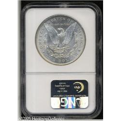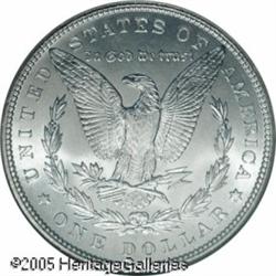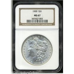 <B>1900<img border='0' src='http://www.heritagecoins.com/images/star.gif' width=10 height=10>$1 MS67 NGC.</B></I> Extraordinary quality for this turn-of-the-century Philadelphia issue. Both sides are white and frosty, with shimmering, satiny brilliance in the fields. Unlike many 1900-P Dollars, this example is well detailed in the critical areas over Liberty's ear and on the eagle's breast. As can be expected from the grade, abrasions are virtually non-existent. Population: 18 in 67, 0 finer (1/05).<BR><I>From The Banks Collection.</B></I> Lot:10562