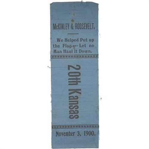 <B>1900 McKinley & Roosevelt Ribbon from Kansas.</B></I> Bold dark blue ribbon from "<I>20th Kansas</B></I>" proudly declares that "<I>We Helped Put up the Flag - Let no Man Haul it Down."</B></I> Dated November 3, 1900, this ribbon exhibits bold, clear lettering, but displays some minor defects - in overall very good condition at 3" x 3.75".<BR><BR><b>Shipping:</b> Flat Material, Small (<a target="_blank" href="http://www.heritageauctions.com/common/shipping.php">view shipping information</a>)