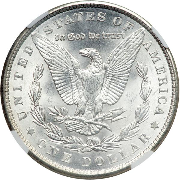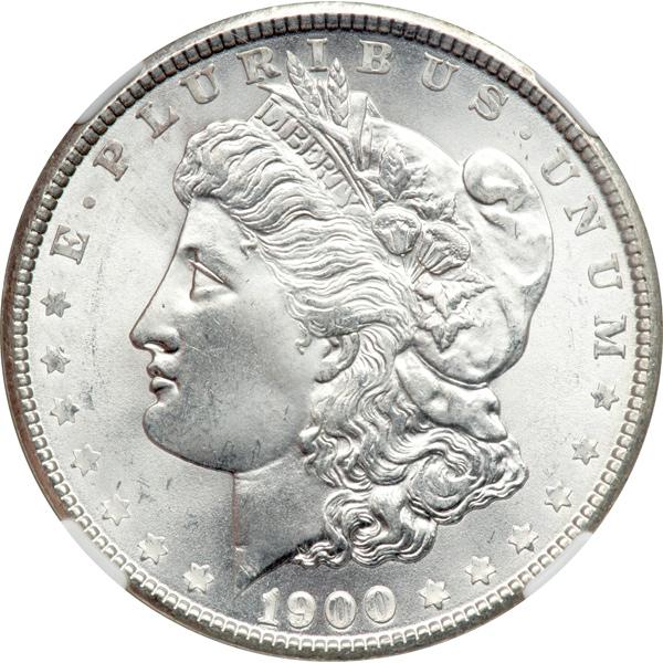 1900 Morgan Dollar. NGC graded MS-67. Moon-glow bright silver-white cartwheel luster radiates on both sides of this superb blast white example. Additionally, this date is easier said than done to find fully struck. The centers pack a great deal of detail into the design from a decidedly precision strike. Pop 34; none finer at either service (PCGS # 7264) .