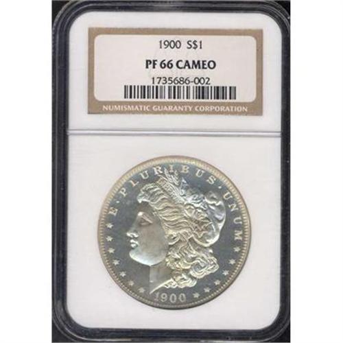 <b>1900 Morgan Dollar. NGC graded PF66 CAM.</b> Swirling frosty luster rounds out this coin's list of memorable attributes, giving the entire coin its strong cameo-like appearance. This is a strongly struck example, with excellent detail to all the important high points. Where sometimes you'll see the add on "with the possible exception of these regions (standard for the issue)", we are thrilled to say that no such add on is required, the coin is outstanding! Proof mintage was only 912 pieces in 1900.