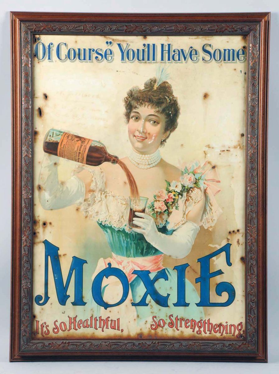 Framed with no glass in newer molding. Loaded with color. This is a richly detailed, classic and desirable sign, not commonly found! Still tacked onto its original wooden sidewalk sign frame. Some rust staining and small holes at and near the edges. With