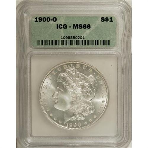 <B>1900-O $1 MS66 ICG.</B></I> PCGS Population (684/29). NGC Census: (687/54). Mintage: 12,590,000. Numismedia Wsl. Price for NGC/PCGS coin in MS66: $460. (#7266)<BR><BR><b>Shipping:</b> Coins & Currency (<a target="_blank" href="http://www.heritageauctions.com/common/shipping.php">view shipping information</a>)