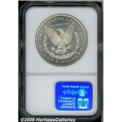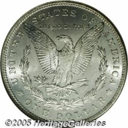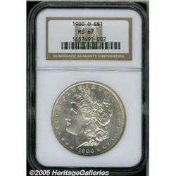 <B>1900-O<img border='0' src='http://www.heritagecoins.com/images/star.gif' width=10 height=10>$1 MS67 NGC.</B></I> This is a delightful example with exceptional aesthetic appeal. The 1900 issue from New Orleans was struck in excessive quantities, with many saved and available to numismatists from the Treasury Hoard of the 1960s. Most of those were lower grade Mint State examples and Superb Gem coins remain quite rare today. There has never been a finer example certified by NGC. This lovely dollar has brilliant silver surfaces and is entirely untoned, with reflective fields and light cameo contrast. It represents the finest quality available to collectors today. Population: 27 in 67, 0 finer (2/05).
