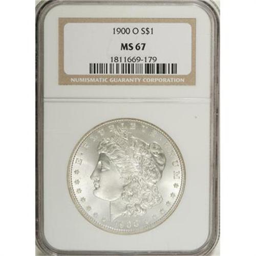 <B>1900-O $1 MS67 NGC.</B></I> Well struck throughout, with Superb surfaces that are untoned and nearly pristine. A faint grease streak (as made) along Liberty's jawline does not affect the technical grade of the piece, and does minimal harm to the overall eye appeal of this conditionally elusive New Orleans Mint product. Census: 54 in 67, 0 finer at either service (6/07). <BR><I>From the Reuben Reinstein Collection.</B></I><BR><BR><b>Shipping:</b> Coins & Currency (<a target="_blank" href="http://www.heritageauctions.com/common/shipping.php">view shipping information</a>)