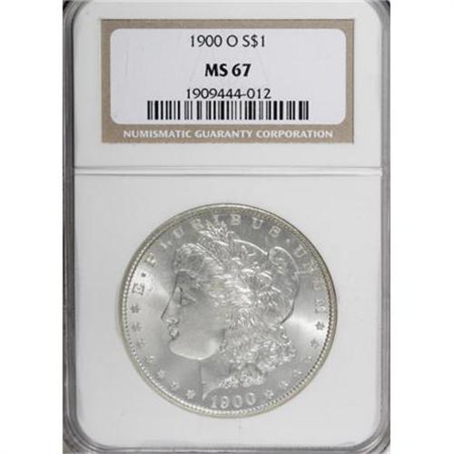 <B>1900-O $1 MS67 NGC.</B></I> A boldly struck and essentially brilliant Superb Gem. The fields appear immaculate, and even Liberty's portrait has only trivial surface imperfections. Despite the reputation of the New Orleans Mint, the strike is crisp throughout. Neither NGC nor PCGS have certified any in finer grades (3/08).<BR><I>From The Silver Spur Collection of Morgan Dollars.</B></I><BR><BR><B>Coin Engraver:</B> George T. Morgan<BR><BR><b>Shipping:</b> Coins & Currency (<a target="_blank" href="http://www.heritageauctions.com/common/shipping.php">view shipping information</a>)