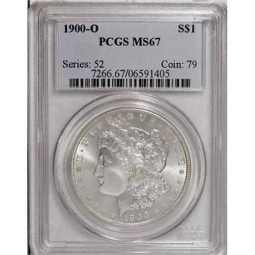 <B>1900-O $1 MS67 PCGS.</B></I> For such a common issue, one that is available in almost any grade, this is an extremely important opportunity. Neither PCGS nor NGC has ever graded a finer example of this issue. This is a fully brilliant Superb Gem with bright silver surfaces and frosty luster. Population: 29 in 67, 0 finer (12/07).<BR><I>From The Jimmy G. PCGS Registry Collection of Morgan Dollars with Varieties.</B></I><BR><BR><B>Coin Engraver:</B> George T. Morgan<BR><BR><b>Shipping:</b> Coins & Currency (<a target="_blank" href="http://www.heritageauctions.com/common/shipping.php">view shipping information</a>)