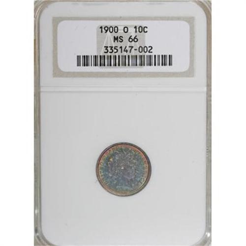 <B>1900-O 10C MS66 NGC.</B></I> The 1900-O ranks as a challenging acquisition in AU or higher grades for the set collector. It is seldom seen above Fine condition and definitely a rare item in Mint State, let alone MS66. This is a colorfully toned example that is uncommonly well defined throughout including the legends, Liberty's head, and the detail on the wreath. A mottled overlay of sea-green, turquoise, and deep red toning blankets each side. There are no singularly mentionable marks or other identifiers on either side. This example is presently tied with five others from NGC and another five from PCGS as the finest certified (12/07).<BR><BR><B>Coin Engraver:</B> Charles E. Barber<BR><BR><b>Shipping:</b> Coins & Currency (<a target="_blank" href="http://www.heritageauctions.com/common/shipping.php">view shipping information</a>)