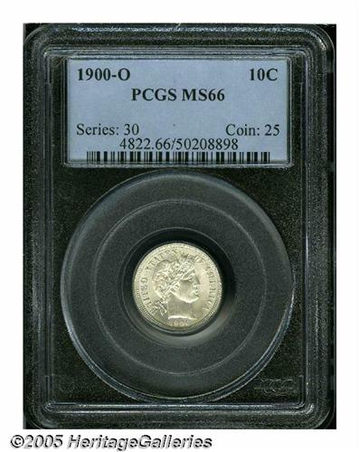 <B>1900-O<10C> MS66 PCGS.</B></I> A satiny white example of this date. The strike is fairly sharp on Liberty, but we do note slight weakness on the lower right oak leaf on the portion closest to the rim. On Liberty's cheek there is a tiny nick just above her jaw line, and this probably edged this coin out of an even higher grade. Ample luster resides in the field to please the eye and this is a coin that any specialist will appreciate. As nice as any seen and possibly a contender for the Finest Known of the date. Population: 3 in 66, 0 finer (6/05).