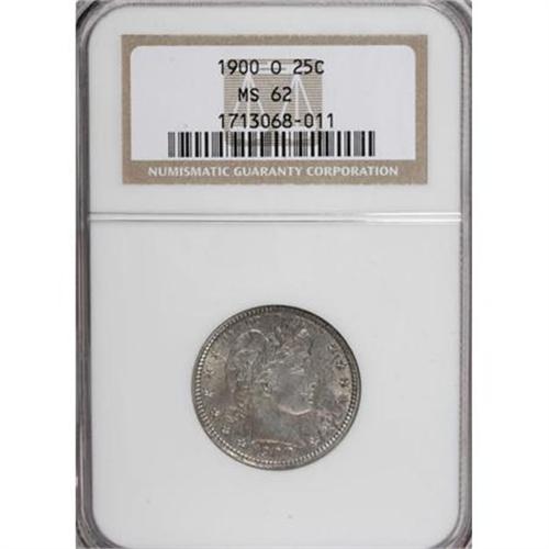 <B>1900-O 25C MS62 NGC.</B></I> NGC Census: (9/46). PCGS Population (6/46). Mintage: 3,416,000. Numismedia Wsl. Price for NGC/PCGS coin in MS62: $575. (#5626)<BR><BR><B>Coin Engraver:</B> Charles E. Barber<BR><BR><b>Shipping:</b> Coins & Currency (<a target="_blank" href="http://www.heritageauctions.com/common/shipping.php">view shipping information</a>)