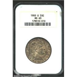 1900-O 50C MS63 NGC. Writing in the 1991 book The Complete Guide to Barber Halves, David Lawrence states that perhaps 65-80% of 1900-O Half Dollars were softly struck. On the other hand, this is a well produced survivor with bold overall definition that wanes slightly over the eagle's right (facing) shoulder. There are a few wispy abrasions on the obverse, none of which are sizeable, and none of which are out of context with the MS63 level. In fact, the surfaces are uncommonly smooth for the grade with original, mottled, olive-tan toning. A shallow obverse planchet void (as struck) is noted over Liberty's cheek.From the Ohio Collection. Important notice: We expect to be auctioning lots at the rate of 200-250 per hour. Sometimes eBay Premier live bid software cannot keep up with that pace, so we strongly recommend that you place a realistic proxy bid now as insurance to avoid disappointment. Also please note that all Heritage/CAA lots purchased through eBay Premier carry a 20% Buyer's Premium. Please make sure you read the Terms and Conditions.