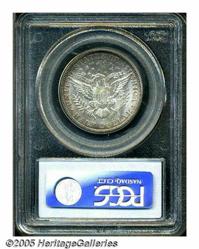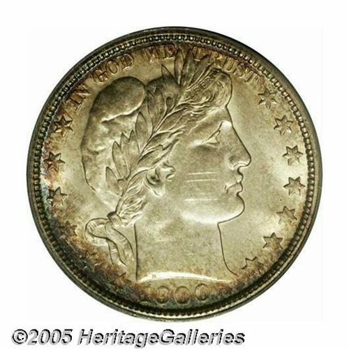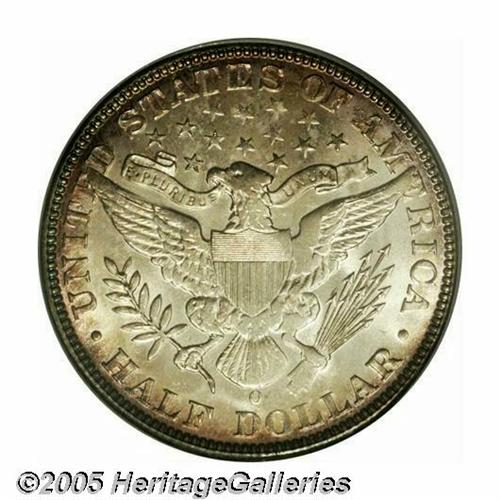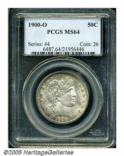 <B>1900-O<50C> MS64 PCGS.</B></I> Although more than 2.7 million pieces were struck, few Barber Half Dollar issues can compete with the scarcity of the 1900-O in better Mint State grades. This satiny representative has typical O-mint softness in the centers and is framed in speckled russet and blue toning. Population: 11 in 64, 4 finer (4/05).