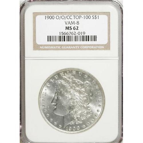 <B>1900-O/O/CC $1 MS62 NGC.</B></I> VAM-8. A Top 100 variety. NGC Census: (228/1385). PCGS Population (482/3730). Numismedia Wsl. Price for NGC/PCGS coin in MS62: $425. (#7268)<BR><BR><B>Coin Engraver:</B> George T. Morgan<BR><BR><b>Shipping:</b> Coins & Currency (<a target="_blank" href="http://www.heritageauctions.com/common/shipping.php">view shipping information</a>)